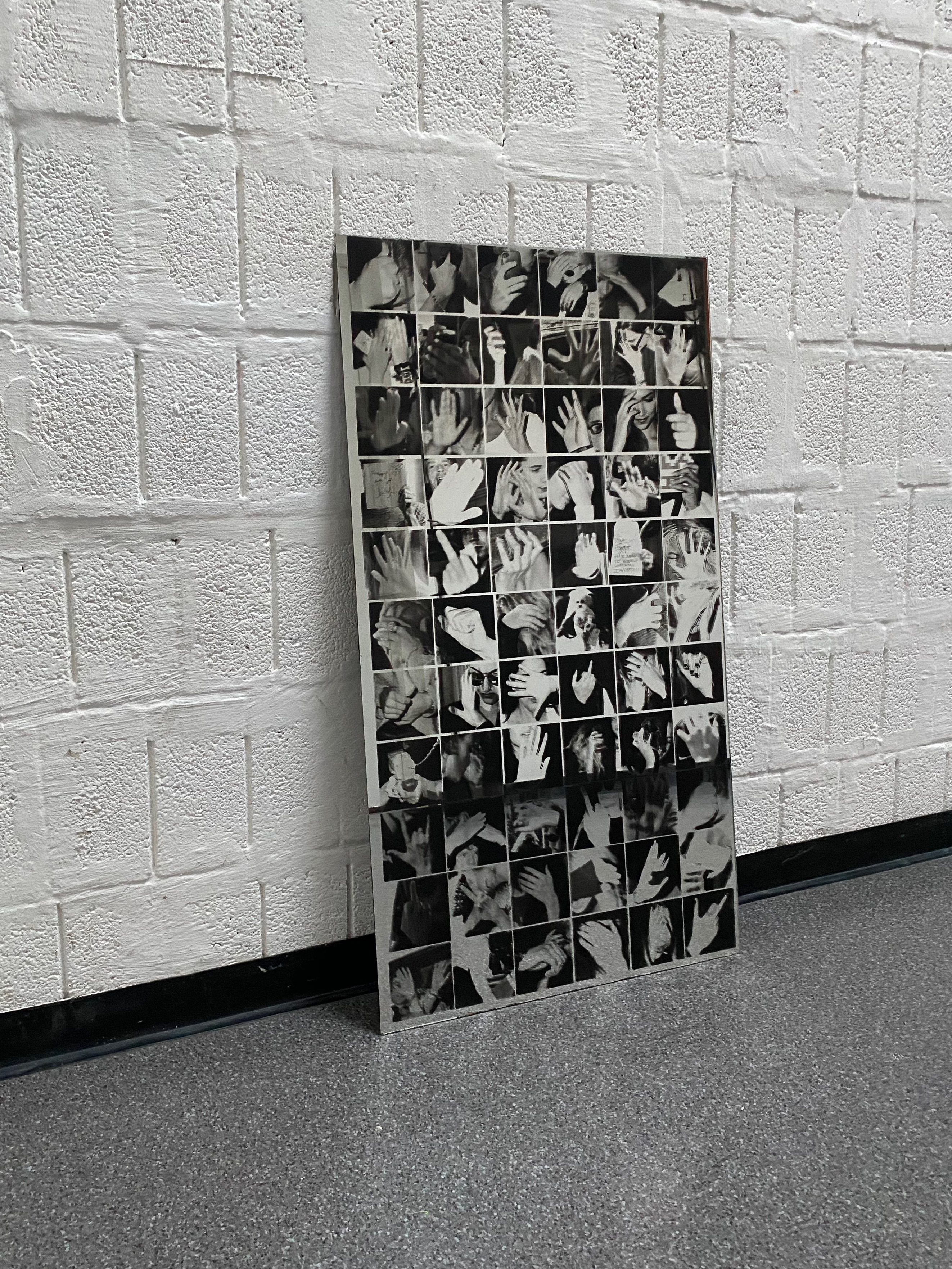 Schwarz-weiß Foto mit deiner an eine Wand gelehnte Tafel mit Abbildungen von Handgesten
