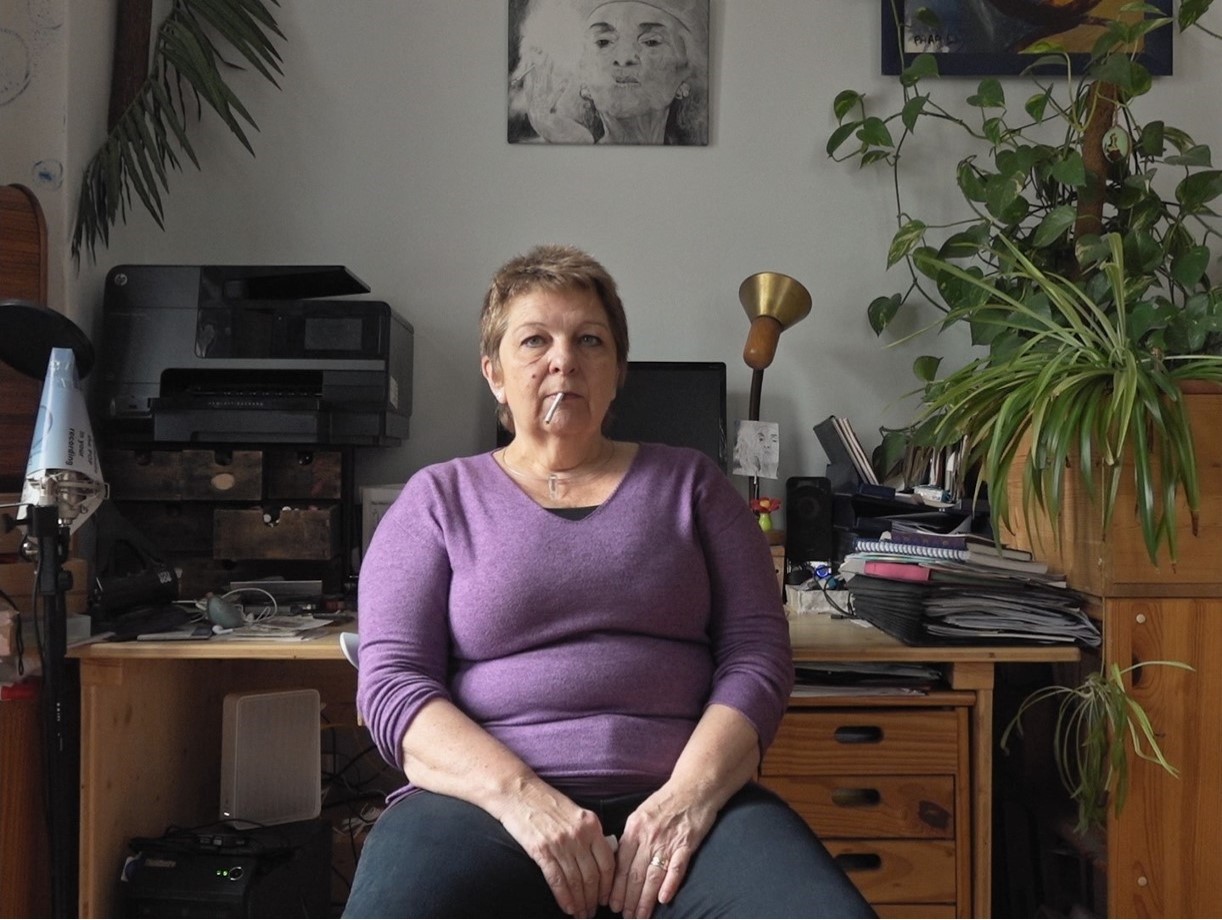 Frau sitzt in einem Arbeitszimmer vor einem vollgeräumten Tisch mit einer Zigaretten im Mund
