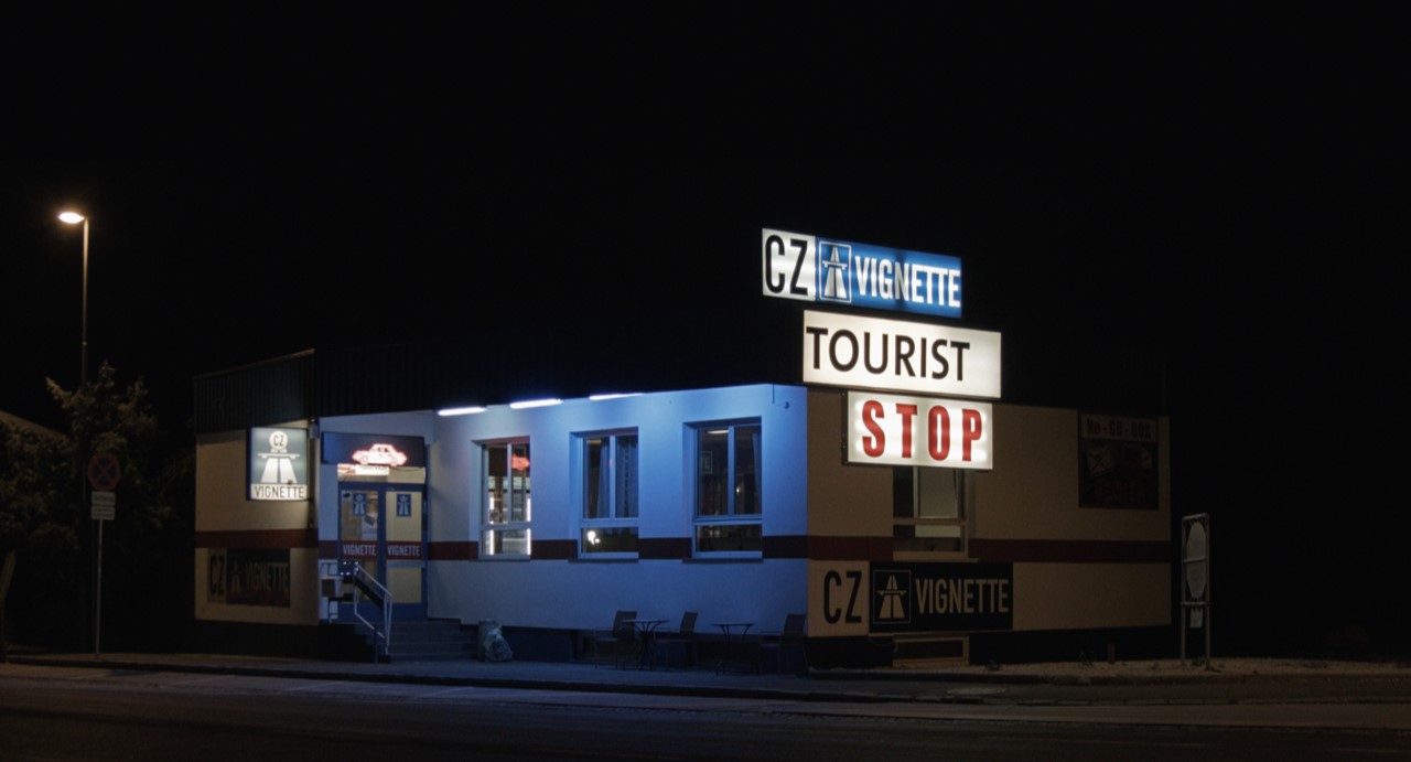 Autobahnstop für Vignetten für tschechische Autobahn mit Leuchtreklameschildern "Vignette", "Stop", "Tourist"