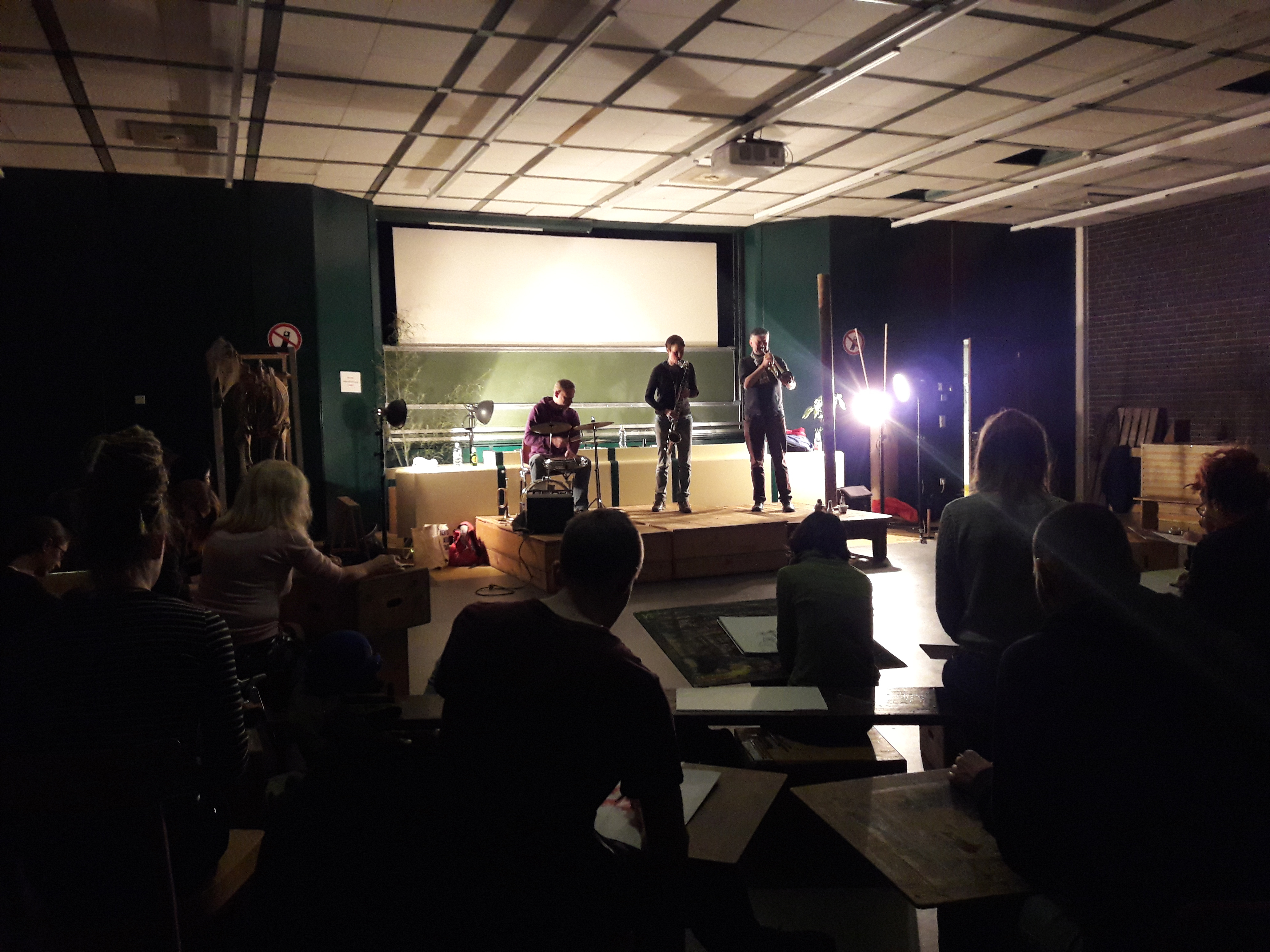Drei Personen auf einer Bühne und Zuschauer_innen im Aktsaal