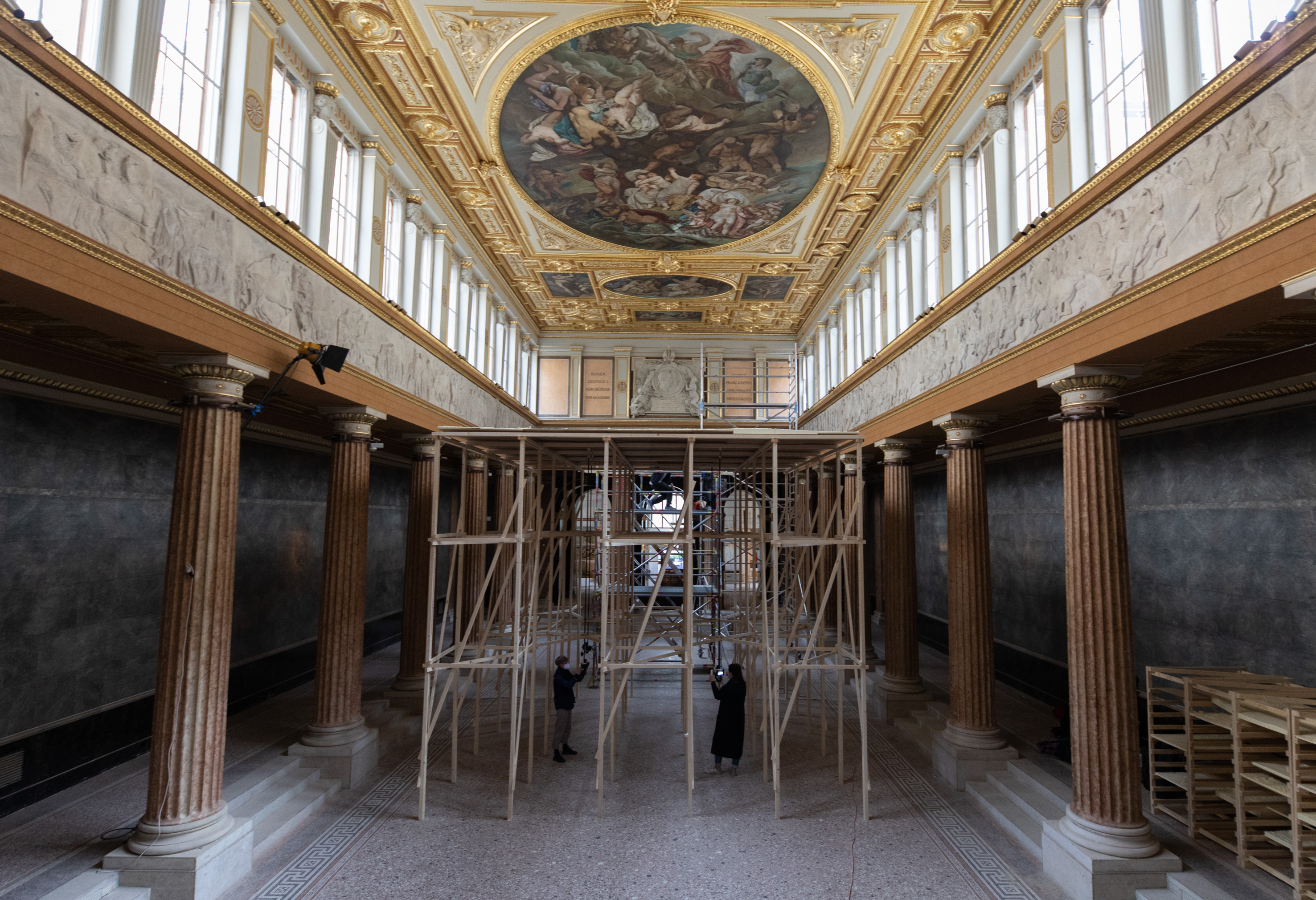 Klassische Architektur der Aula am Schillerplat mit dem Holzgerüsz der Installation und Personen im Raum