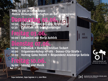 Unser Programm wird, inspiriert von der „Chautauqua“ Bewegung, einen temporären offenen Bildungs-, Kultur- und Begegnungsort an der Schnittstelle zwischen Wohngebiet, Bürotürmen und Freizeitareal einrichten. Es werden nicht kommerzielle kulturelle Aktivitäten und Ausschnitte aus dem Lehrbetrieb öffentlich angeboten, die sich vor allem an Bewohner_innen Kagrans und der Donaucity als auch an Passant_innen richten. Jugendliche aus Kagran werden durch Kooperation mit der Berufsschule für Gartenbau und Floristik eingebunden.