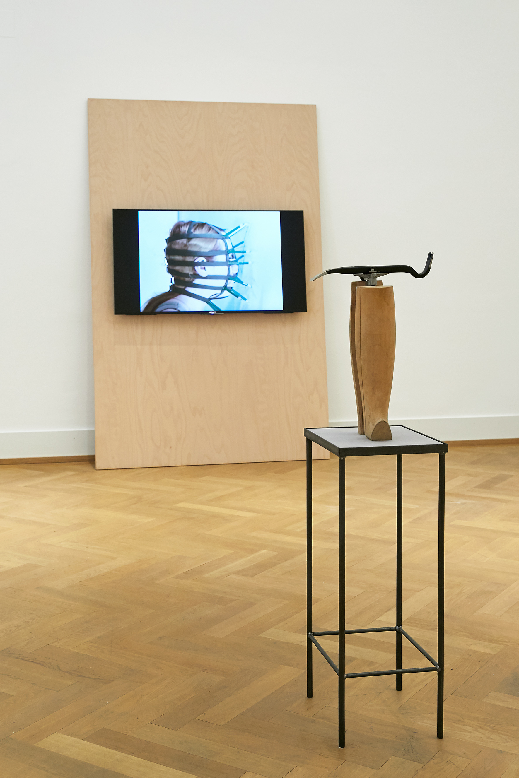 Mit Arbeiten von li nach re.: Rebecca Horn, Performances II, Bleistiftmaske, Video 1972, Viktoria Tremmel, Sich Eier selber nähen, Objekt, 2010