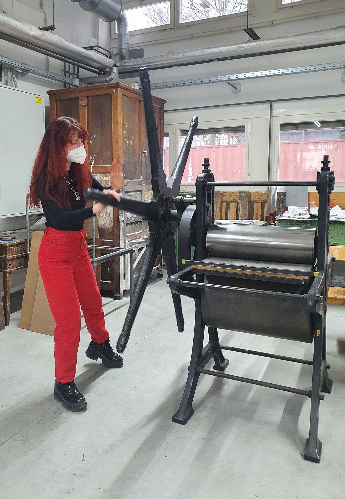 Eine Studentin in einer roten Hose dreht an einem großen Rad einer Druckmaschine