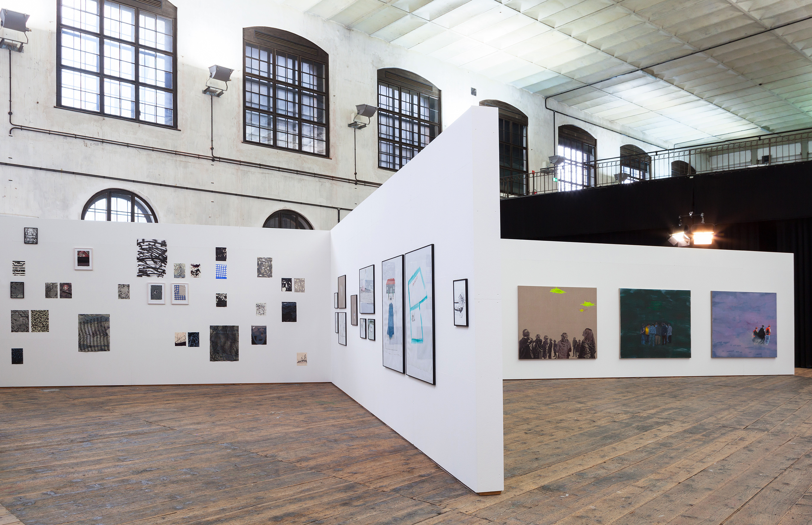 Einblick Aula, Masterarbeiten Architektur, im Vordergrund: Arbeit von Rena Giesecke, im Hintergrund (von links nach rechts): Arbeiten von Lukas Gschweitl, Alois Hehenberger, Süreya Elsa Miller, Avin Fathulla