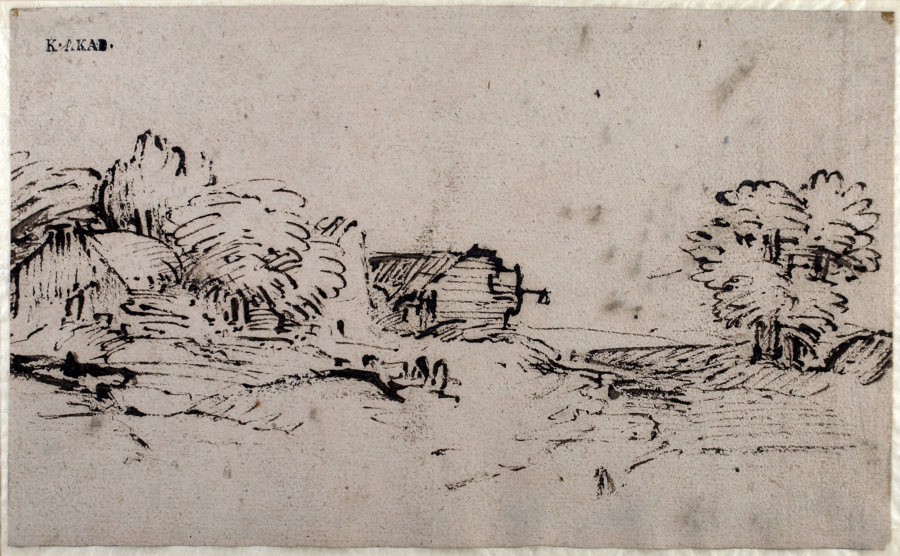 Rembrandt Harmensz. van Rijn (1606-1669), Landschaft mit Schenke und Bauernhäusern unter Bäumen, um 1660, Rohrfeder in Bister, auf Papier