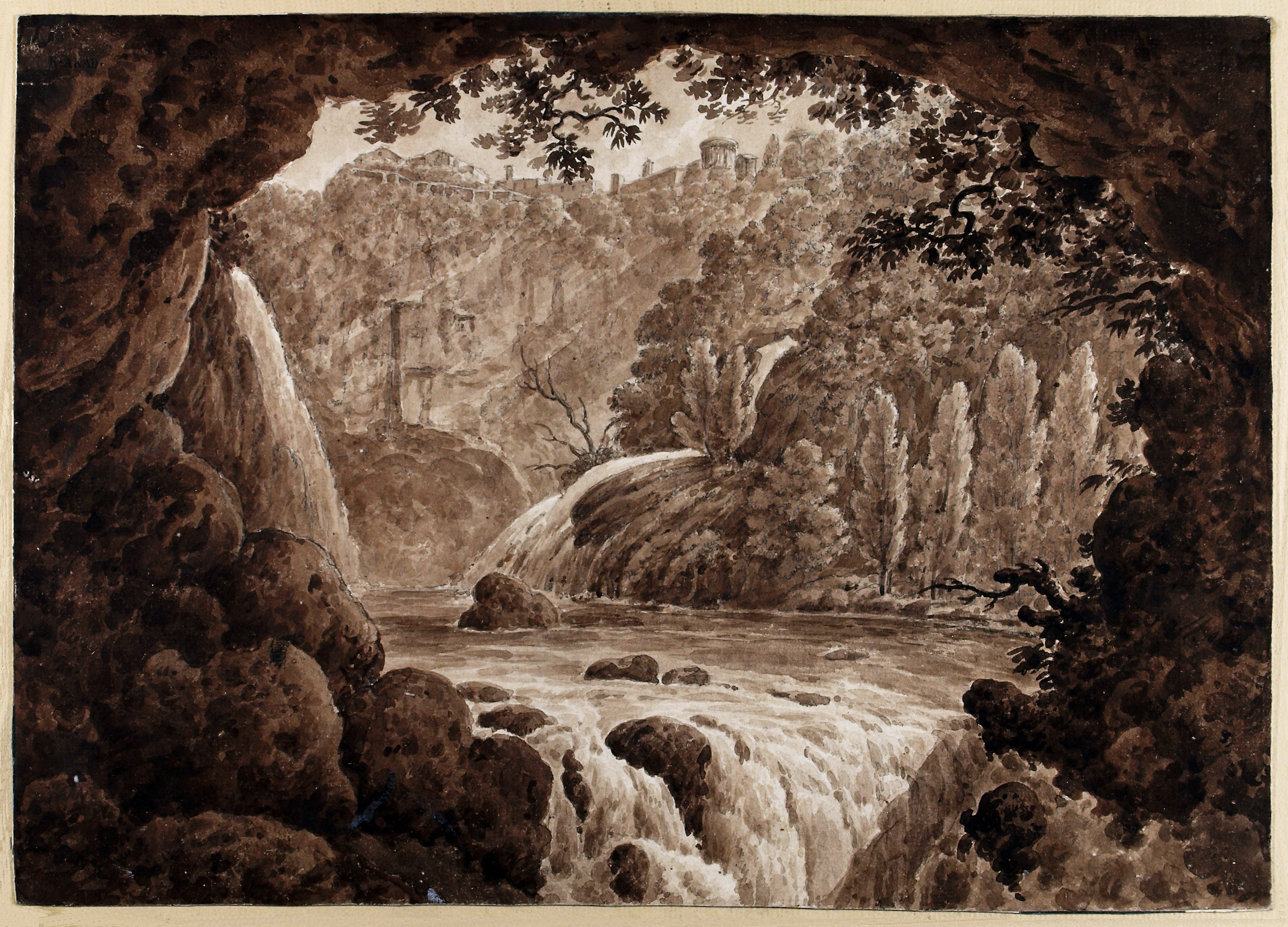 Michael Wutky (1739-1822), Wasserfälle bei Tivoli, letztes Viertel des 18. Jahrhunderts, Pinsel in Braun, Vorzeichnung in Graphit, auf Papier