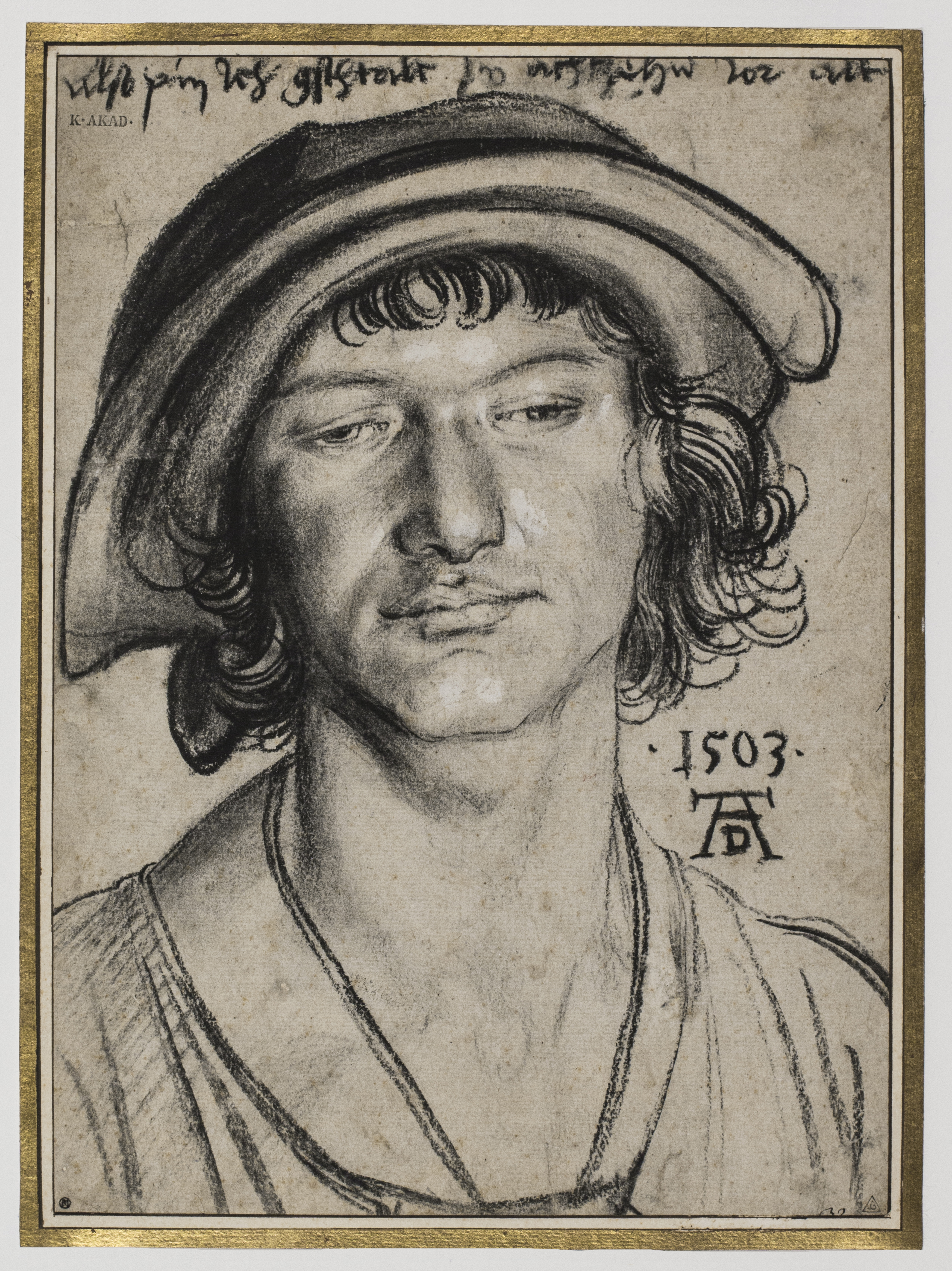 Albrecht Dürer (1471-1528), Bildnis eines 18-jährigen Jünglings, 1503, Kohle, gewischt, mit Deckweiß gehöht, auf Papier, auf Papier kaschiert