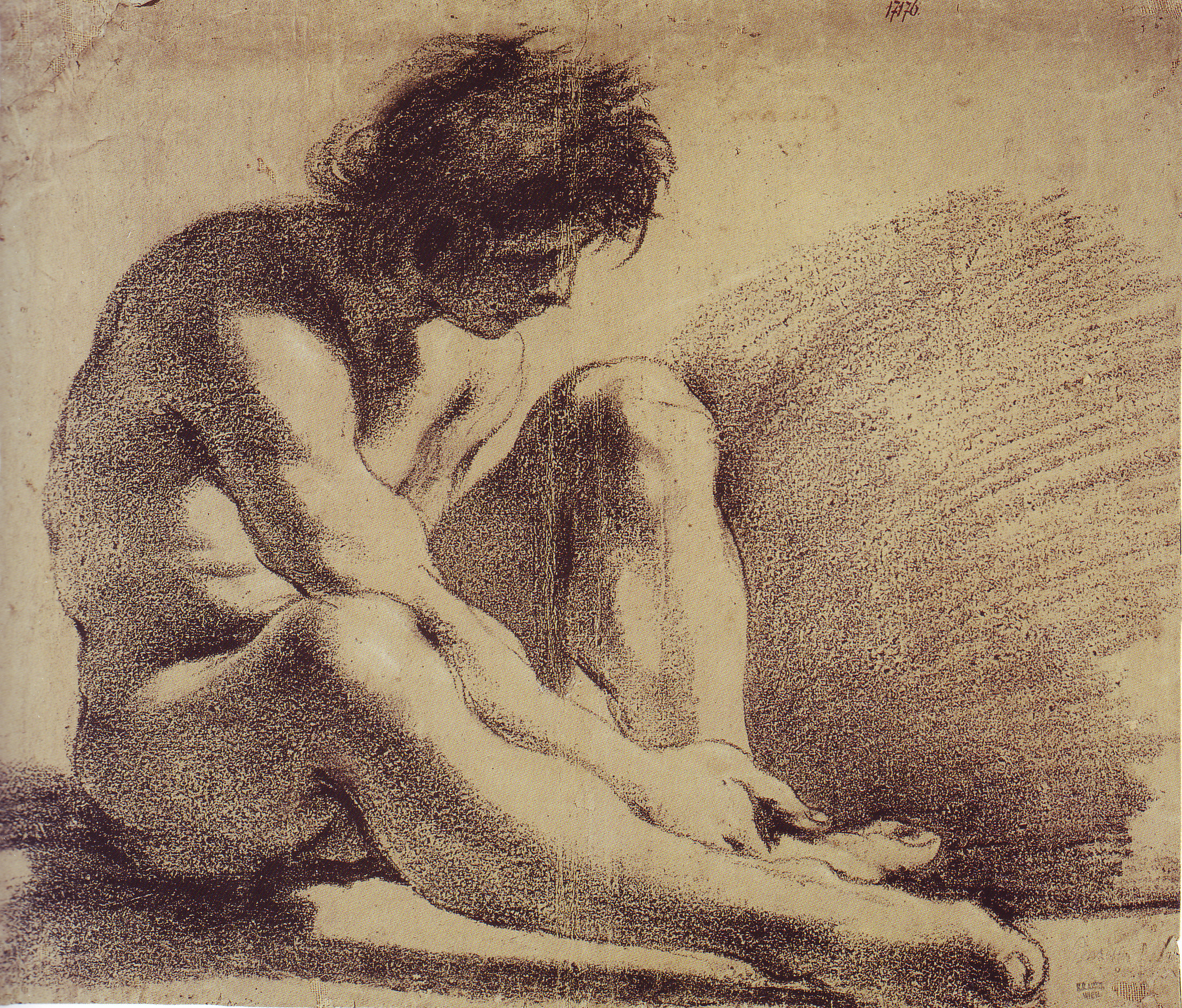 Giovanni Francesco Barbieri, genannt Guercino (1591-1666), Aktstudie eines auf dem Boden sitzenden Jünglings, um 1619, Ölkohle, weiß gehöht, auf braun getöntem Papier, auf Leinwand aufgezogen