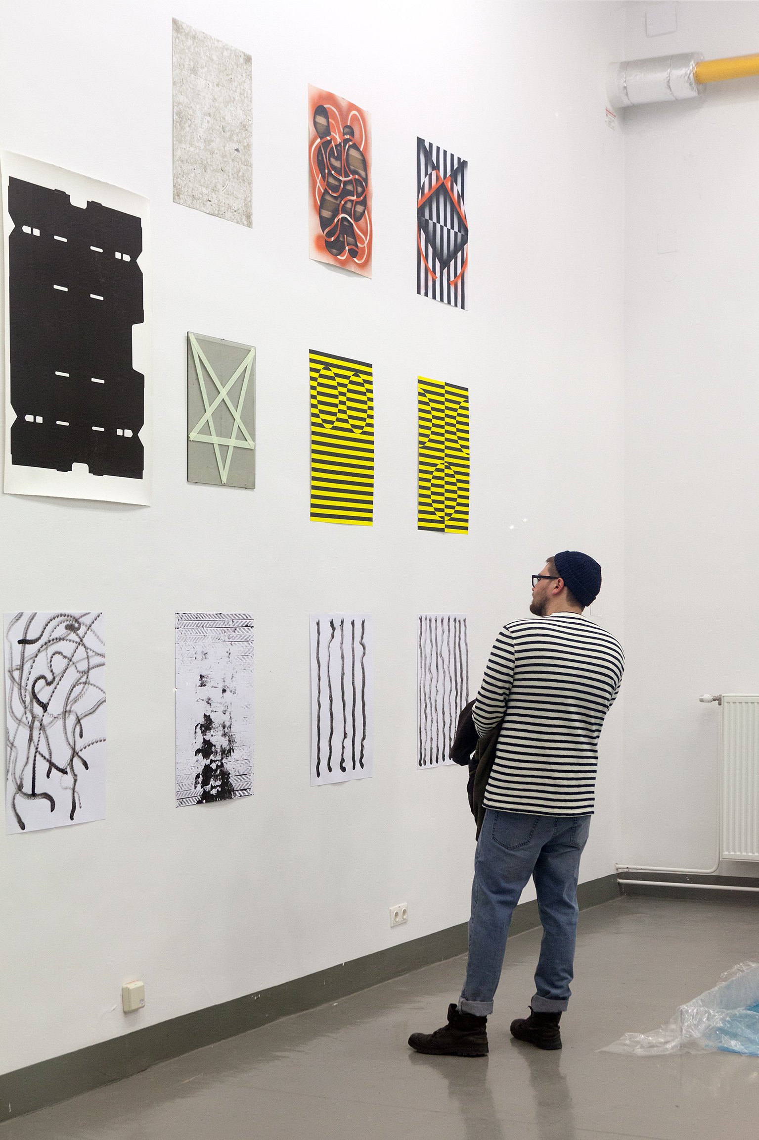 Rundgang 2016, Einblick Fachbereich Grafik und druckgrafische Techniken, mit Arbeiten im Vordergrund von Annamaria Tatu und im Hintergrund von Christian Rothwangl