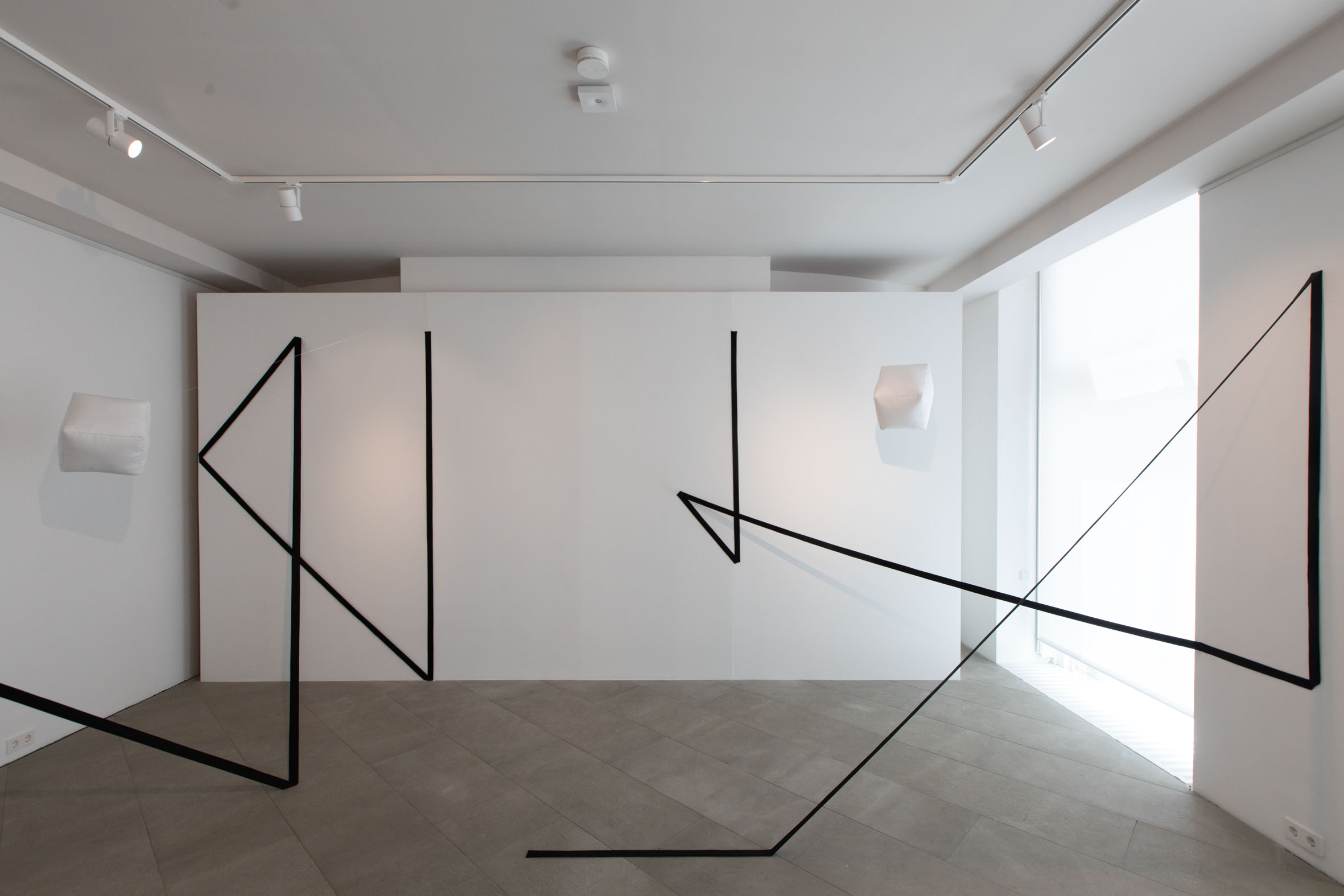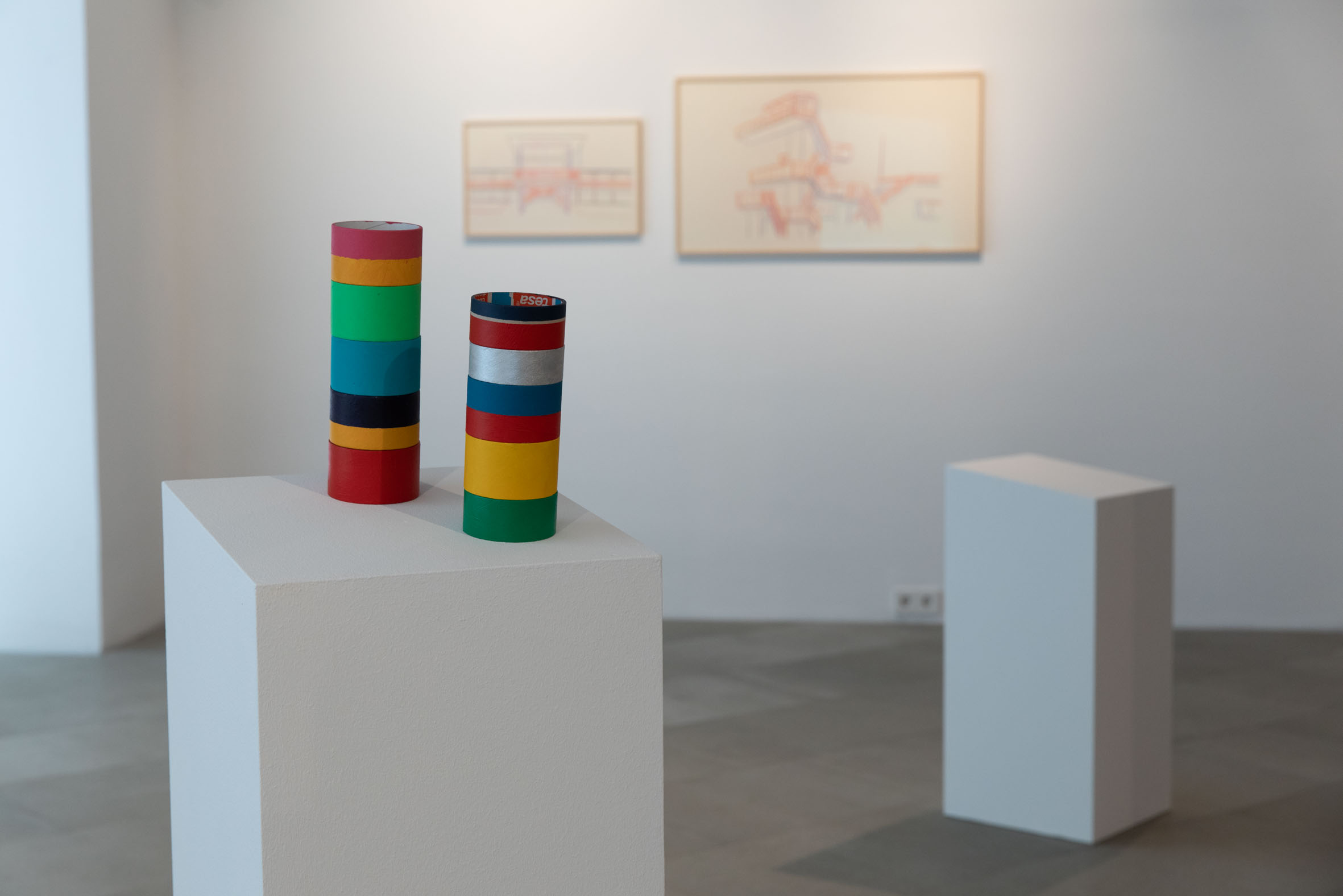 Einblick in die Ausstellung Abschlussarbeiten 18-19 im xE, Diplom von Andreas Dvořák, Ringe , 2019, Acryl auf Klebeband Rollen, Objekt auf Plexiglas, auf Podest