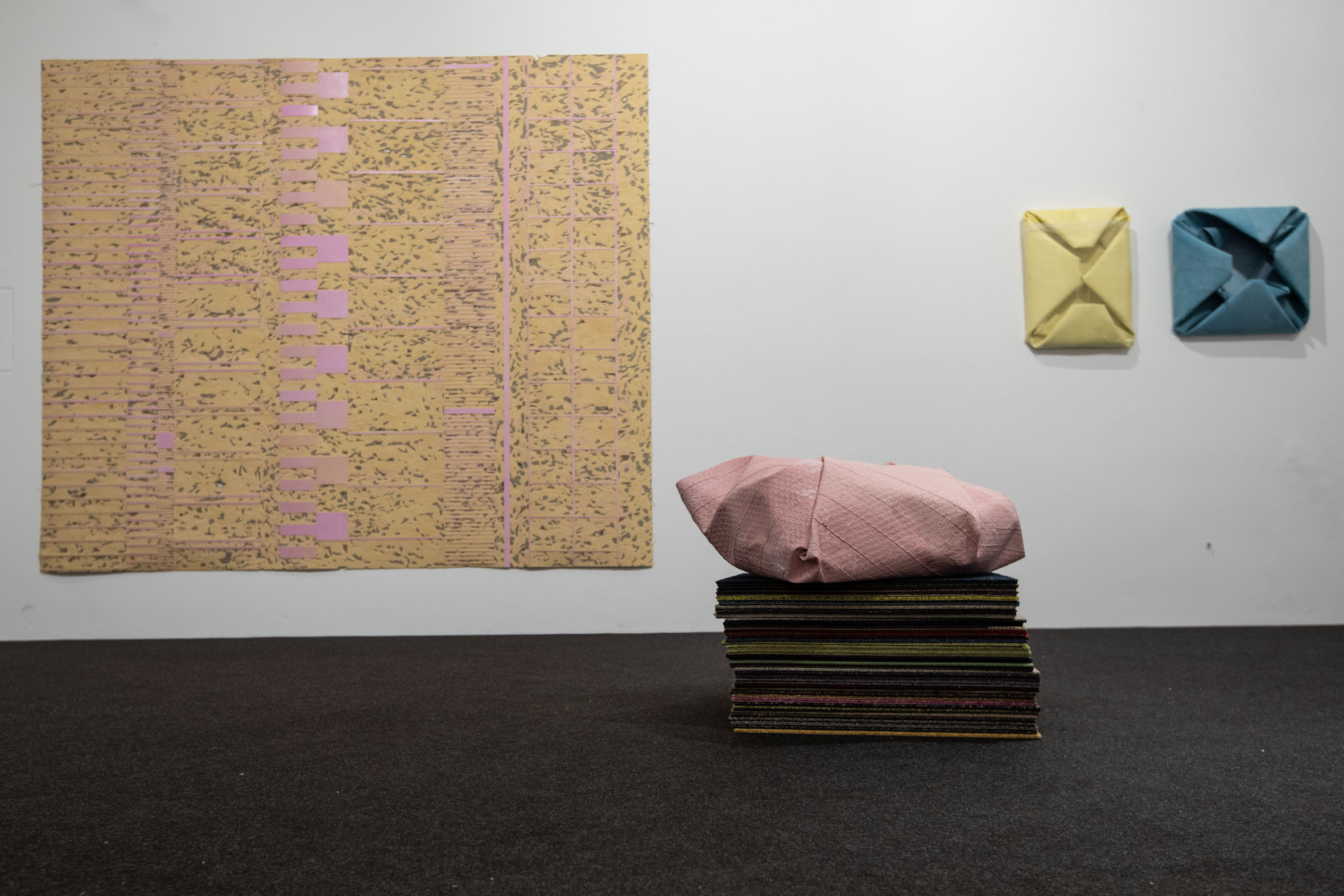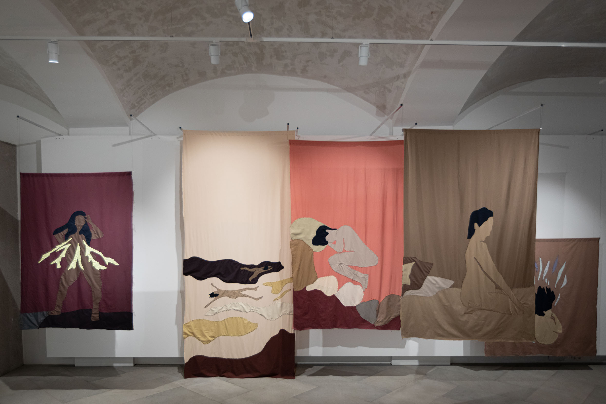 Einblick in die Ausstellung Abschlussarbeiten 18-19 im xE, Diplom von Sophie Utikal, When they returned to their bodies, they returned home , 2019, Stoff
