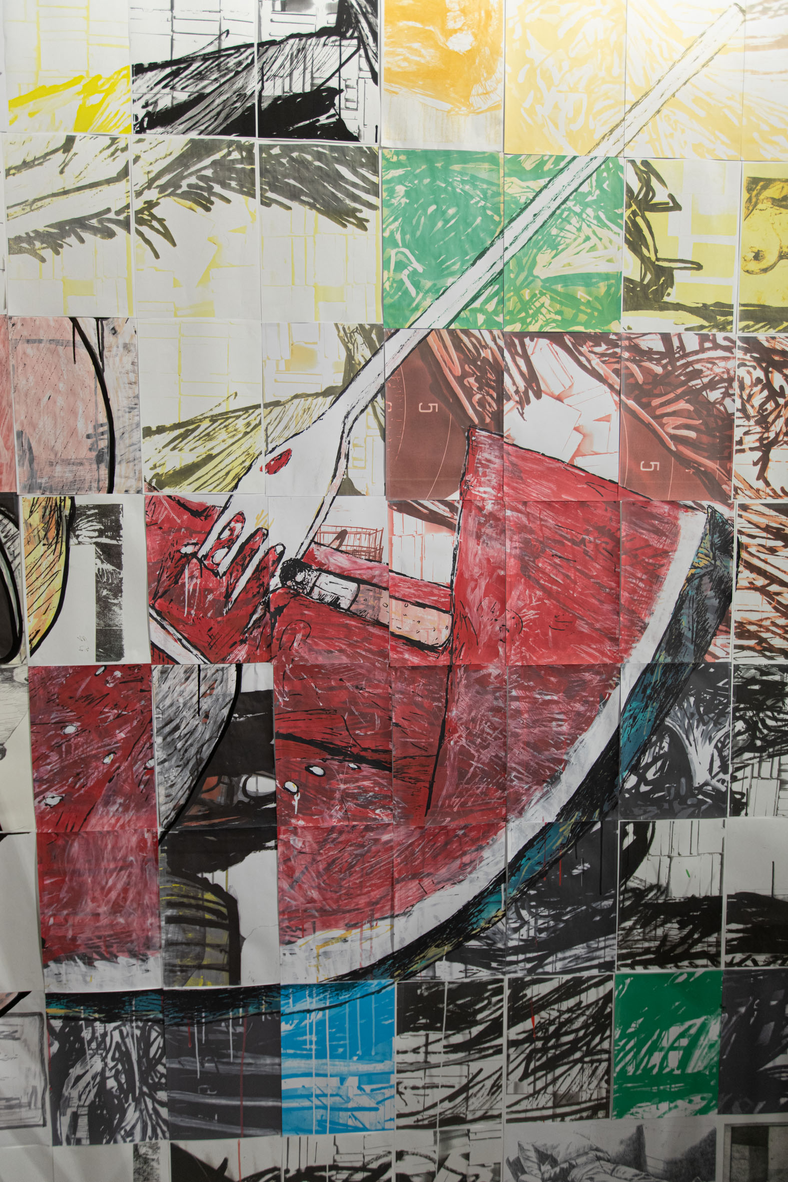 Einblick in die Ausstellung Abschlussarbeiten 18-19 im xE, Diplom von Oliver Riedel, To hold at arm's length , 2019, Collage, Klebeband, Acryl, Laser- und Inkjetkopien auf Papier