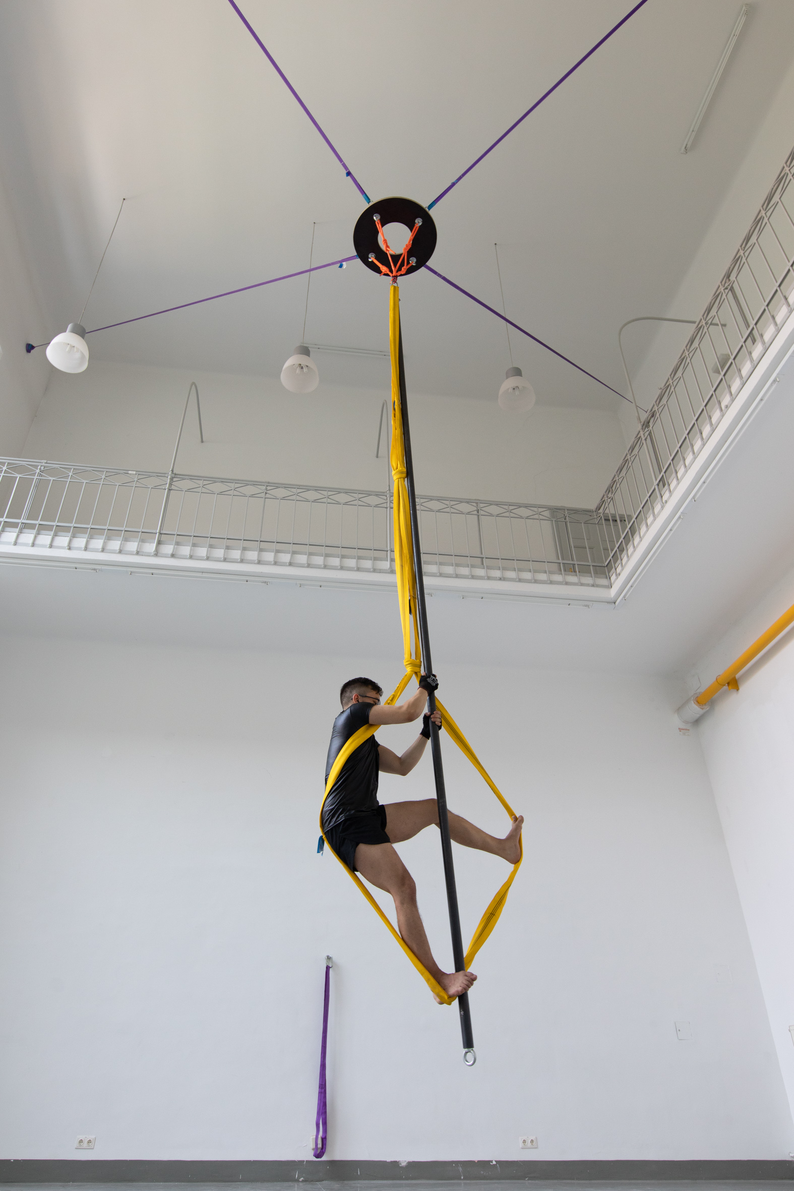 Einblick in die Ausstellung Abschlussarbeiten 18-19, Diplomperformance von Frederik Alexander Marroquin Krebs