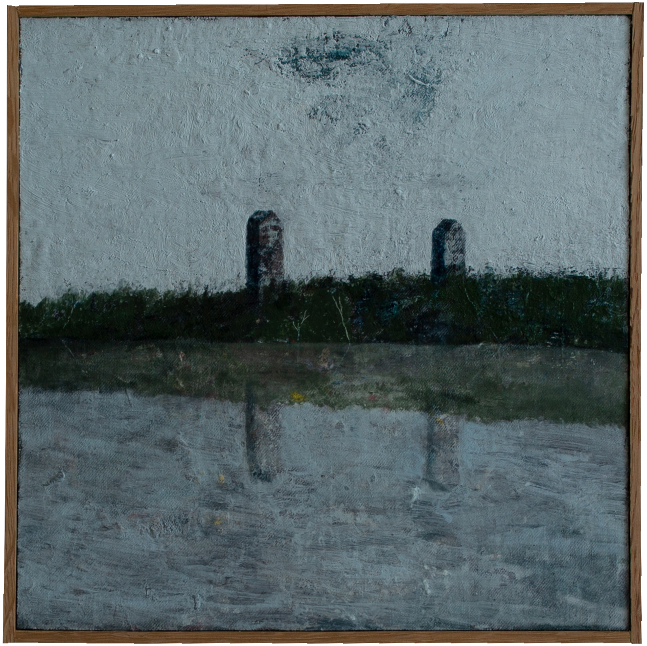 Eiko Gröschl, O.T.(2)(Türme) , Öl auf MDF/ Baumwolle (Künstlerrahmung), 25 x 25 cm, 2019