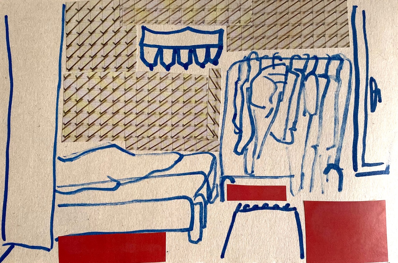 Die Ausstellung Zu Hause warten die Möbel erforscht die Wahrnehmung von Wohnräumen mit ihren Einrichtungsgegenständen. Jeder Raum bekommt durch die Menschen, die ihn bewohnen und einrichten, einen eigenen Charakter, den die Künstlerinnen Nina Gross und Donya Aalipour durch Zeichnungen und Collagen zu erfassen versuchen.