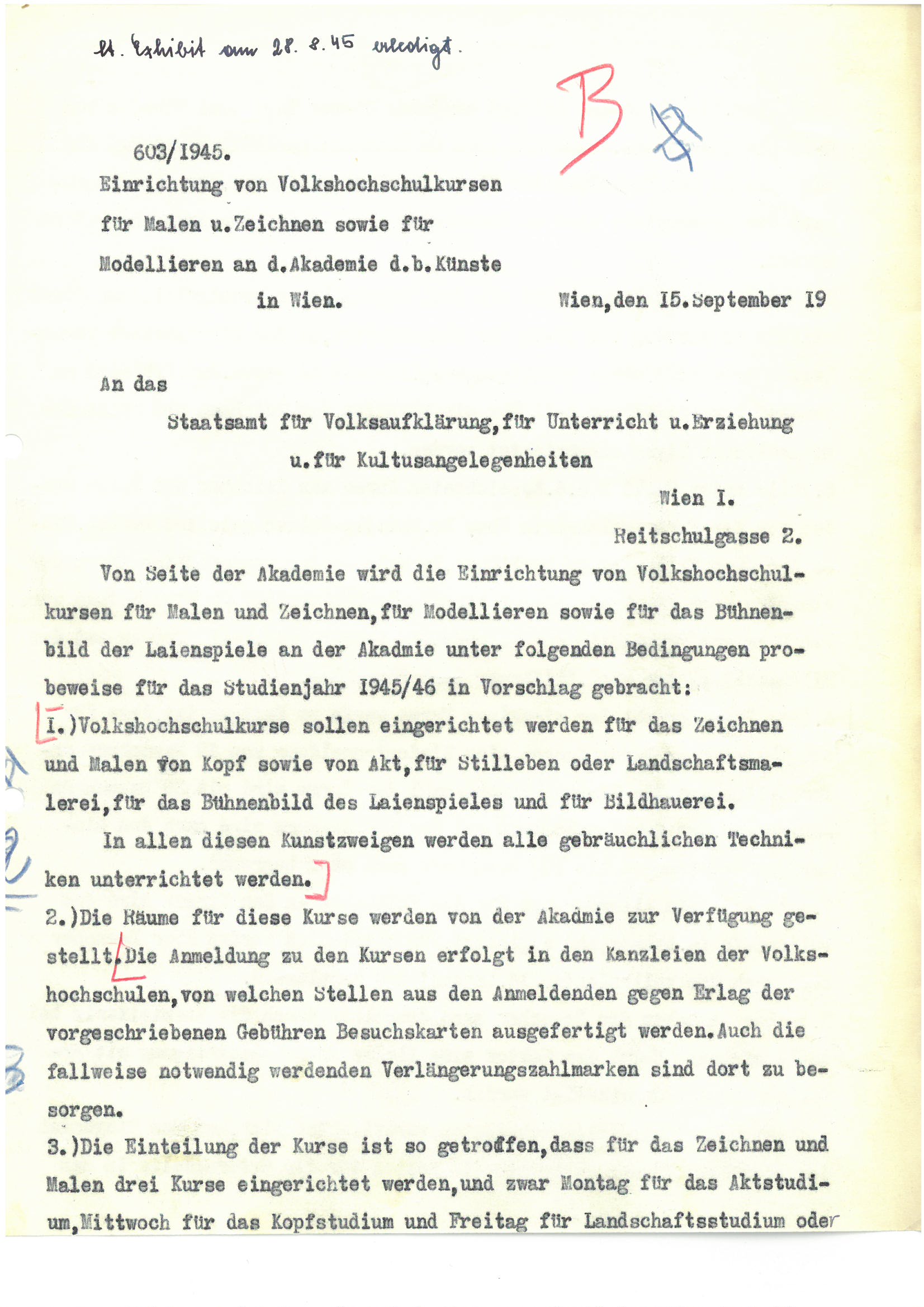 2.) Für die Leitung des zeichnerischen und malerischen, zusätzlichen Unterrichtes an der Meisterschule für Kunsterziehung wird vorgesorgt.