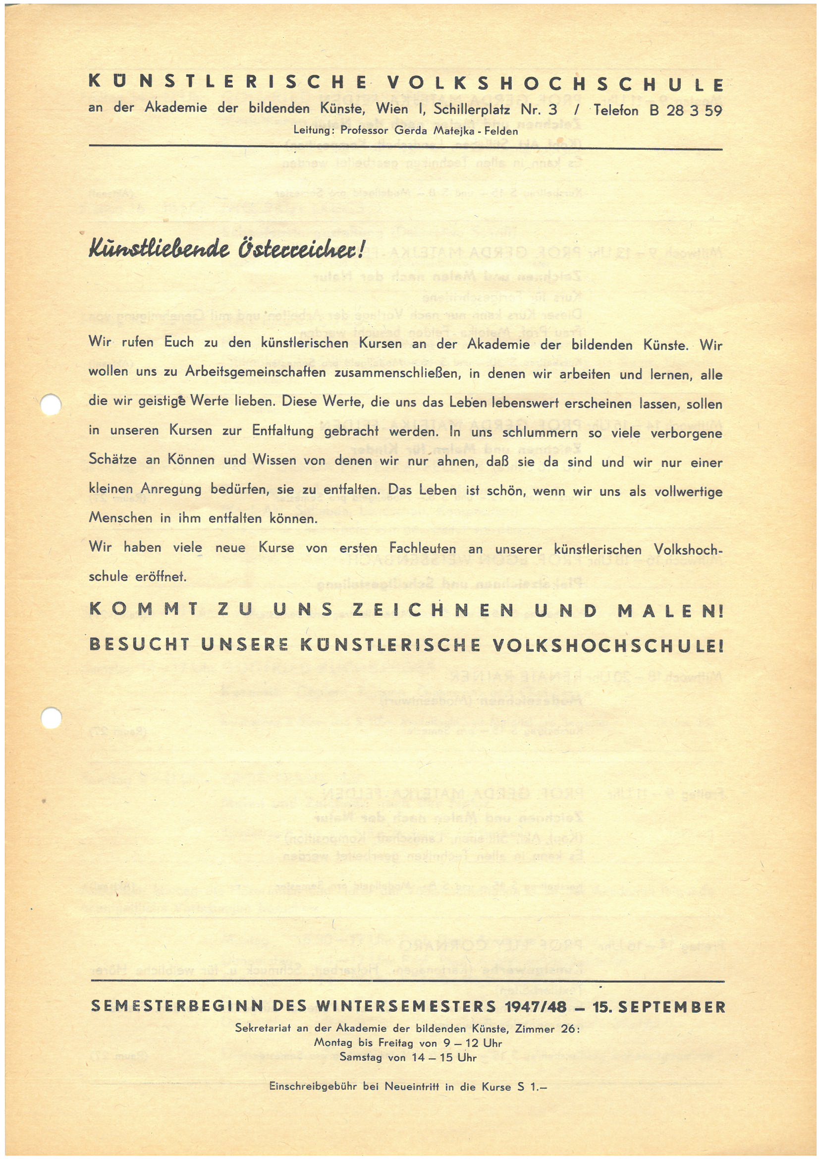 Gerda Matejka-Felden war, wie ihr Ehemann, der Volksbildung verbunden; sie gründete bereits vor dem Krieg die Fachgruppe Zeichnen und Malen im Volksheim Ottakring und, parallel zu ihrer Tätigkeit an der Meisterschule für Kunsterziehung an der Akademie der bildenden Künste Wien, 1945/46 den Verein „Künstlerische Volkshochschule“.