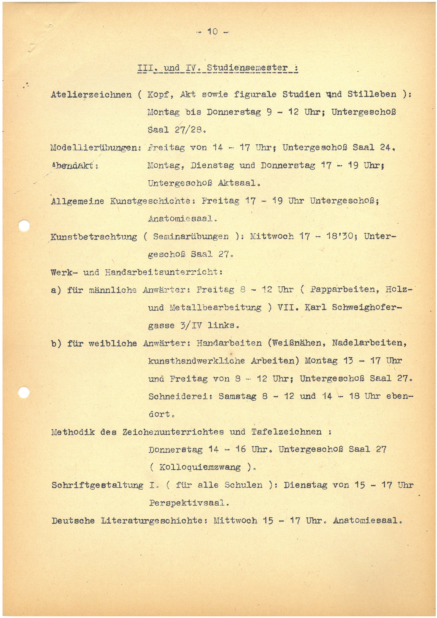 Der Studienplan von 1946 (10) zeigt, welche Schwerpunkte an der Meisterschule für Kunsterziehung unterrichtet wurden: beispielsweise Atelierzeichnen, Modellierübung sowie Kunstbetrachtung und handwerkliche Fächer wie Papparbeiten für männliche, Nadelarbeiten für weibliche Anwärter.