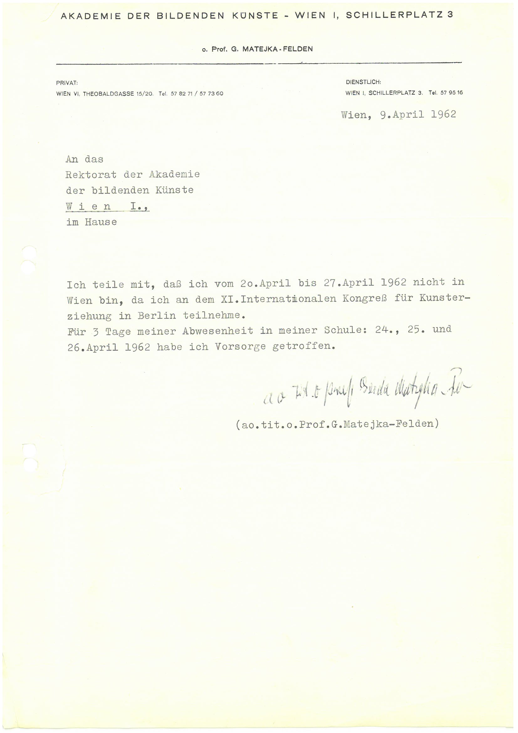 3.) Für die Betreuung mit diesen unter 1 und 2 genannten Unterrichtsaufgaben soll Frau Gerda Matejka-Felden einen für das Sommersemester 1945 und für das Wintersemester 1945/46 befristeten Lehrauftrag bei lehramtlicher Vollbeschäftigung erhalten. […]“
