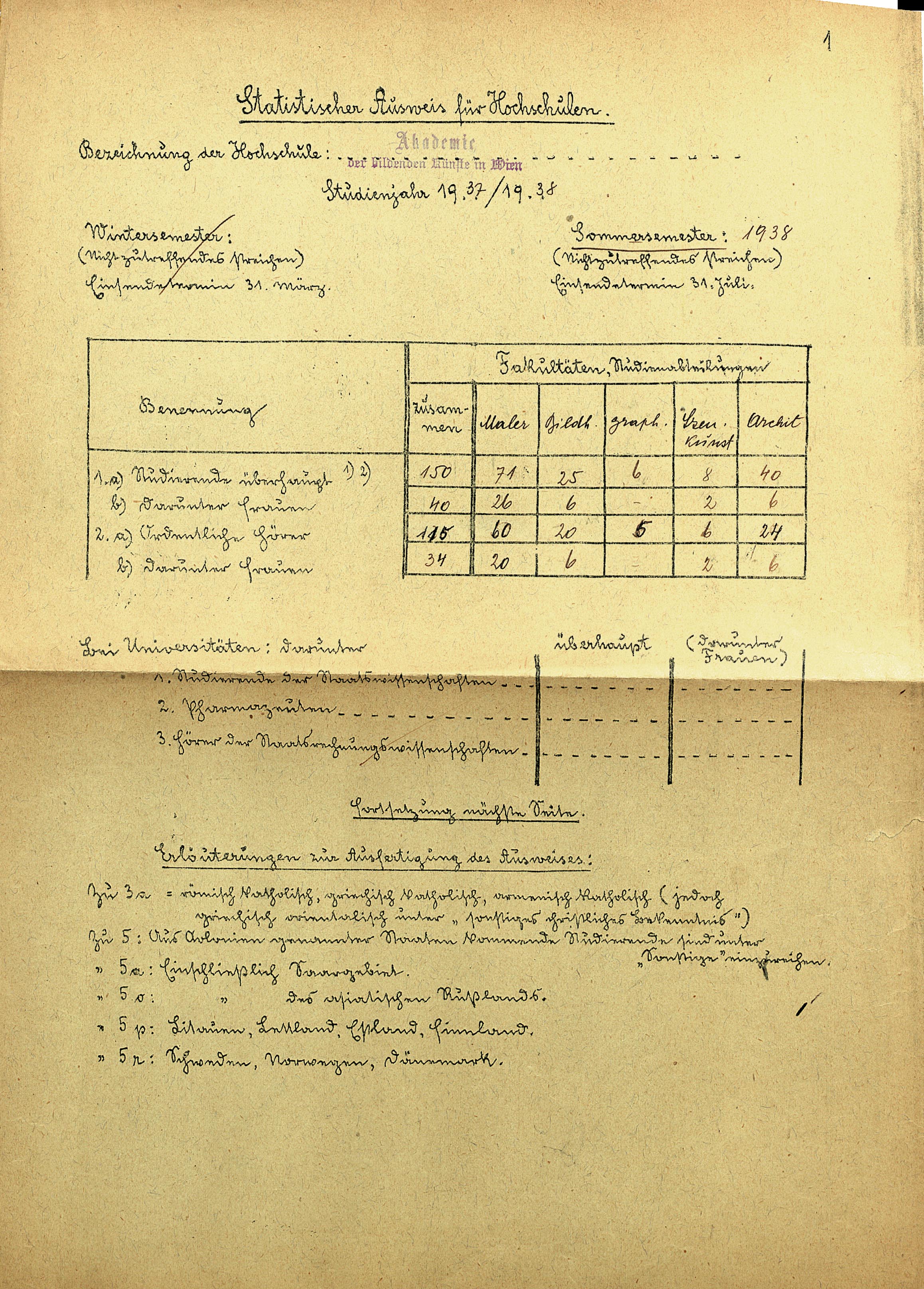 Die Machtübernahme der Nazis im März 1938 hatte eine „Säuberungswelle“, auf die die Akademie sehr gut vorbereitet war, zur Folge. Es wurde ein Numerus clausus von zwei Prozent für inländische Juden festgelegt, älteren Studierenden sollte der Abschluss ermöglicht werden (da dieser die Emigration erleichtern konnte); eine besondere Rolle spielte die „Studentenführung“, die über die Aufnahme von Studierenden entscheiden konnte. (20) Im Sommersemester 1938 besuchten laut Statistik 150 Studierende die Akademie (davon 40 Frauen), (21) darunter vier Personen jüdischer Religion.