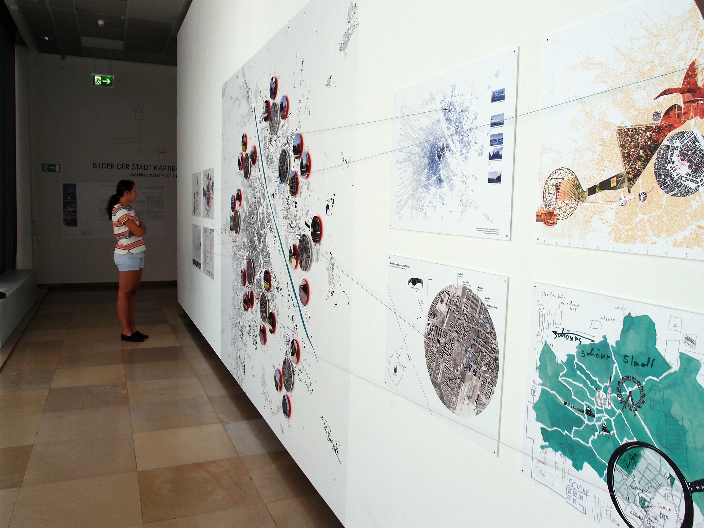 The eight maps are hung on the long wall, while the central city plan shows the location of the schools. A brochure with a selection of drawings by and interviews with the students accompanies the presentation.